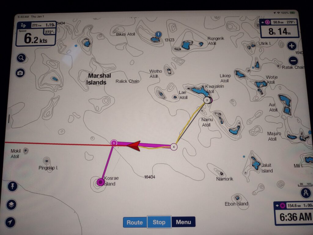 sv Bad Bunny current route before sunrise, sailing from Kwajalein Atoll in the Marshall Islands to Kosrae Island in the Federated States of Micronesia on January 1, 2026.