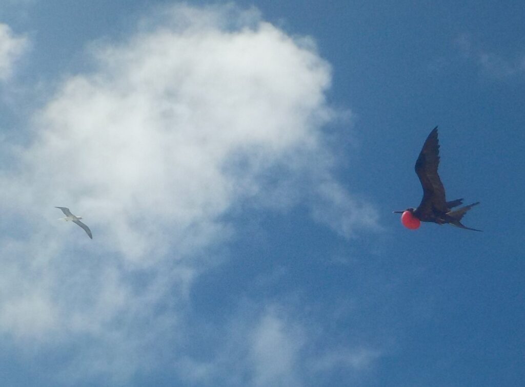 Approaching the anchorage, we were surprised by many friendly birds hovering over the boat. Stepping onto the beach for the first time, countless birds in the blue sky flew over us, some almost within touching distance.