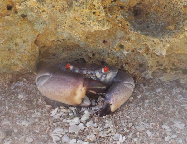 Previously, a sailor told us about picking up many lobsters at night during low tide. One night, John woke me up at 1 am. Carrying a big bucket and a flashlight, and wearing a headlamp, we carefully walked on the jagged reef. Crabs were moving quickly all over. They were a smaller kind of crab, so we didn’t want to catch them. When the tide came in high, we stopped our night outing with a bit of disappointment: not even a single lobster. Mission unsuccessful!