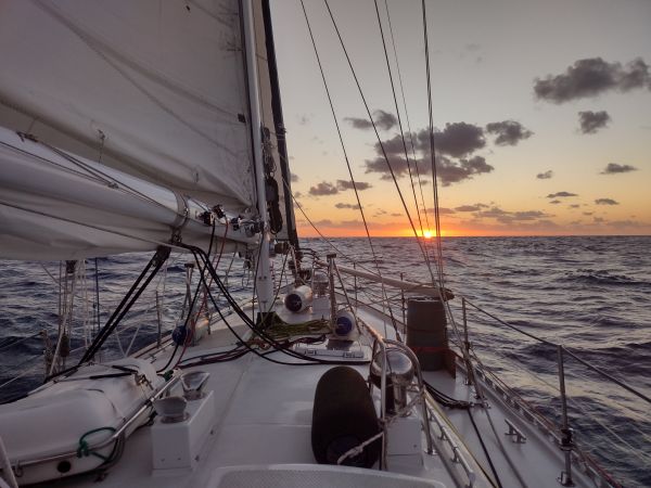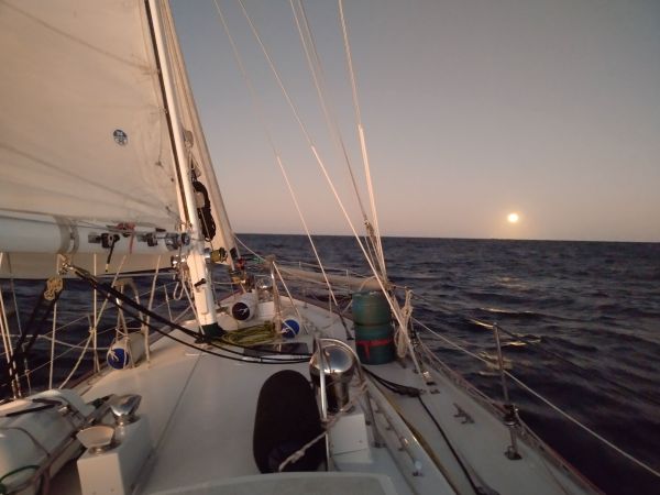 (Sailing Day 1 and 2) It’s 4 AM in the Coral Sea. I hear the waves and John’s snoring – a much better symphony than the angry, gusty seas we battled just an hour ago. That earlier sea state was way beyond my comfort level, forcing us to compromise by sailing a little downwind rather than upwind. The good news? The weather forecast predicts motoring for the next few days, so we can easily correct our course then.